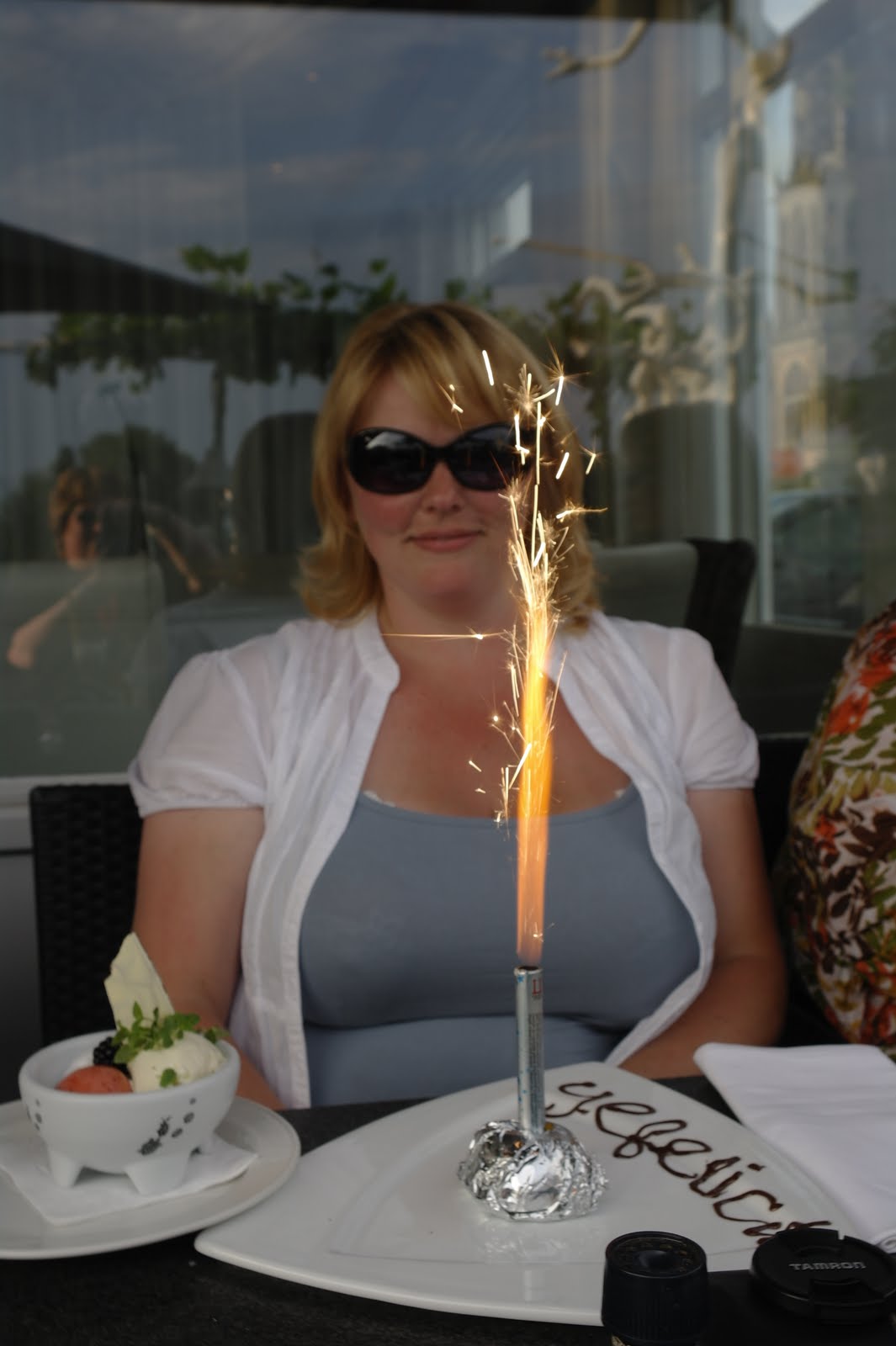 De dames die ons bedienden hadden begrepen dat Sam jarig was en bij het toetje kwam er voor haar een verrassing. Erg leuk gedaan door het personeel.